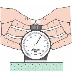 - Giữ máy đo độ cứng cao su giữa hai tay trên mẫu sao cho đầu cảm ứng chạm vào nó.