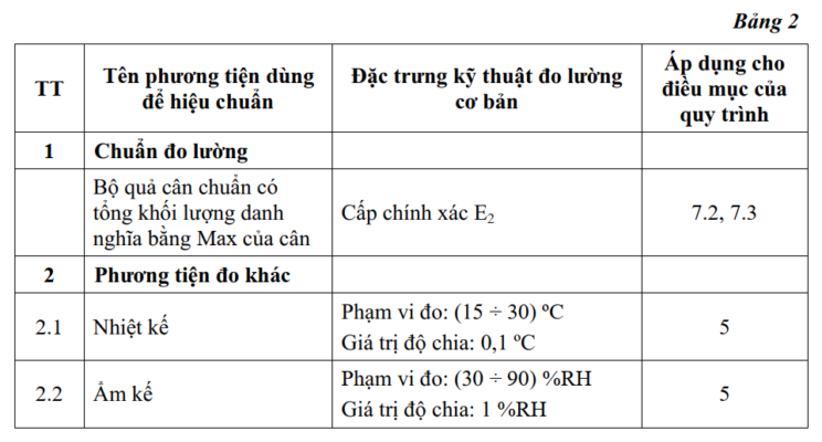 Các phương tiện dùng để hiệu chuẩn cân được nêu trong bảng 2.