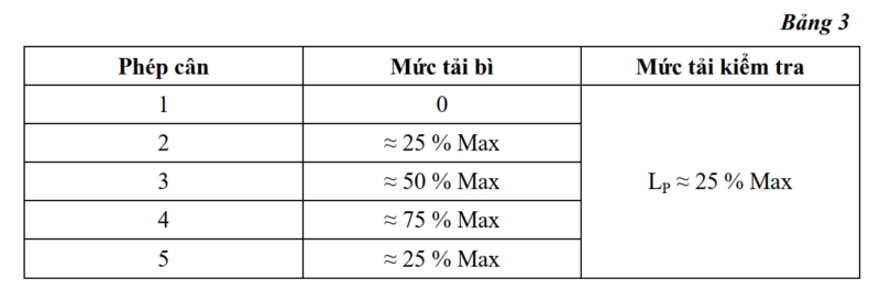 Tiến hành 5 phép cân với mức tải bì và mức tải kiểm tra theo quy định tại bảng 3.