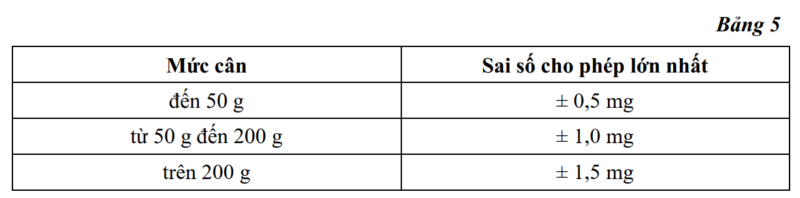 9.2 Cân phân tích sau khi hiệu chuẩn nếu có một trong các độ không đảm bảo đo khi sử dụng tính theo công thức (10) với các giá trị R = 50 g; R = 200 g (nếu Max > 200 g) và R = Max vượt quá sai số cho phép tương ứng quy định tại bảng 5 thì không cấp chứng chỉ hiệu chuẩn mới và xóa dấu hiệu chuẩn cũ (nếu có).