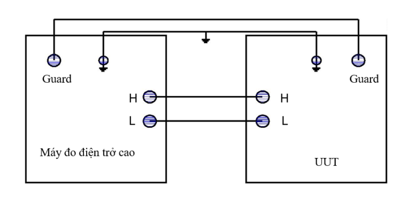 – Đối với hộp điện trở có cực màn chắn (Guard): tiến hành nối cực màn chắn của chuẩn và IUT với nhau hoặc nối theo sơ đồ được nhà sản xuất quy định.